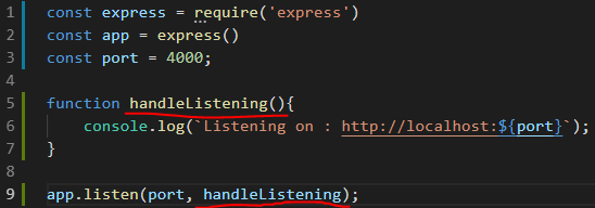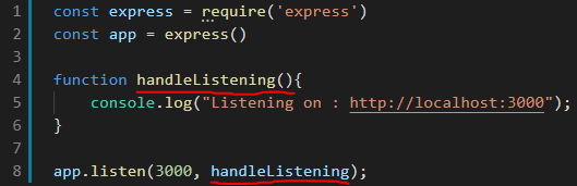 다음과 같이 바꾼 뒤 실행시켜주면 http://localhost:3000 에 접속할 경우 터미널창에는 Listening on : http://localhost:3000라고 나타난다.