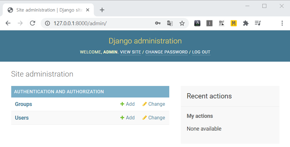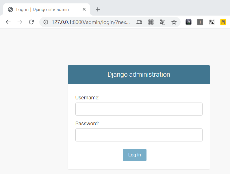 주소창에 http://127.0.0.1:8000/admin을 입력하니 다음창이 뜬다.